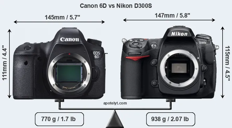 An illustration of the physical size and weight of the Canon 6D and the Nikon D300S is provided in the side-by-side display below. The two cameras are presented according to their relative size. Three successive views from the front, the top, and the rear are shown. All size dimensions are rounded to the nearest millimeter.