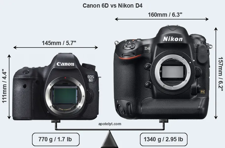 An illustration of the physical size and weight of the Canon 6D and the Nikon D4 is provided in the side-by-side display below. The two cameras are presented according to their relative size. Three consecutive views from the front, the top, and the rear side are shown. All width, height and depth measures are rounded to the nearest millimeter.