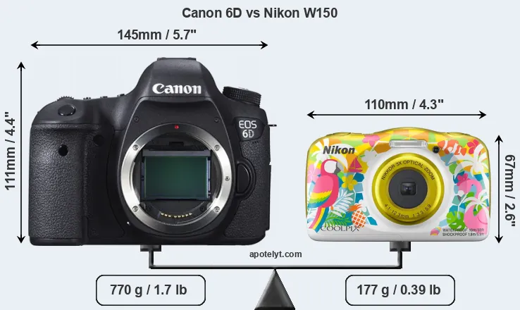The side-by-side display below illustrates the physical size and weight of the Canon 6D and the Nikon W150. The two cameras are presented according to their relative size. Three consecutive perspectives from the front, the top, and the back are available. All width, height and depth dimensions are rounded to the nearest millimeter.