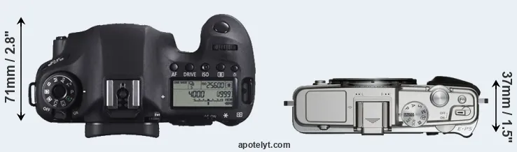 The physical size and weight of the Canon 6D and the Olympus E-P5 are illustrated in the side-by-side display below. The two cameras are presented according to their relative size. Three successive views from the front, the top, and the rear are shown. All width, height and depth measures are rounded to the nearest millimeter.