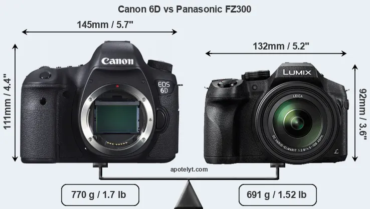 The side-by-side display below illustrates the physical size and weight of the Canon 6D and the Panasonic FZ300. The two cameras are presented according to their relative size. Three successive views from the front, the top, and the rear are shown. All width, height and depth dimensions are rounded to the nearest millimeter.