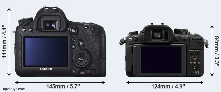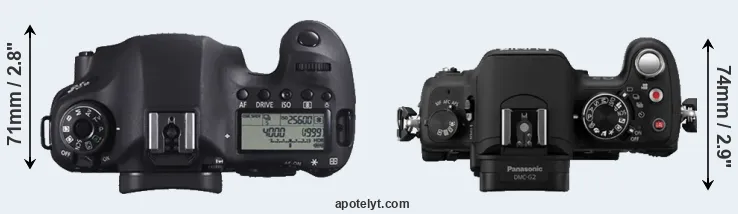 The side-by-side display below illustrates the physical size and weight of the Canon 6D and the Panasonic G2. The two cameras are presented according to their relative size. Three successive views from the front, the top, and the rear are shown. All width, height and depth measures are rounded to the nearest millimeter.