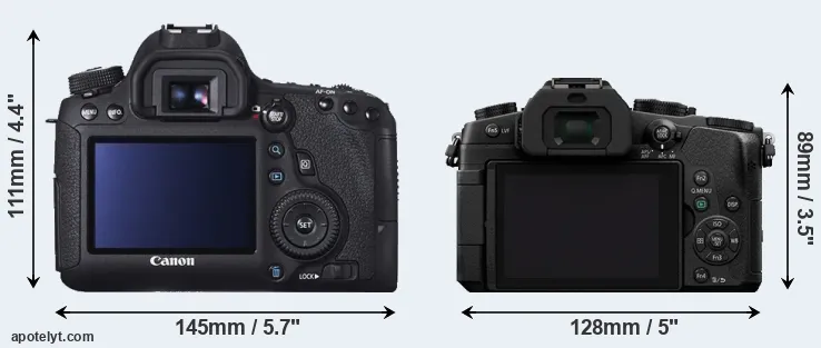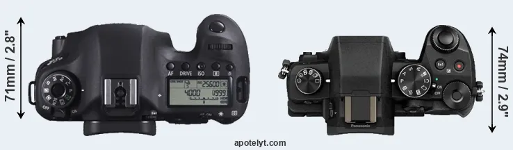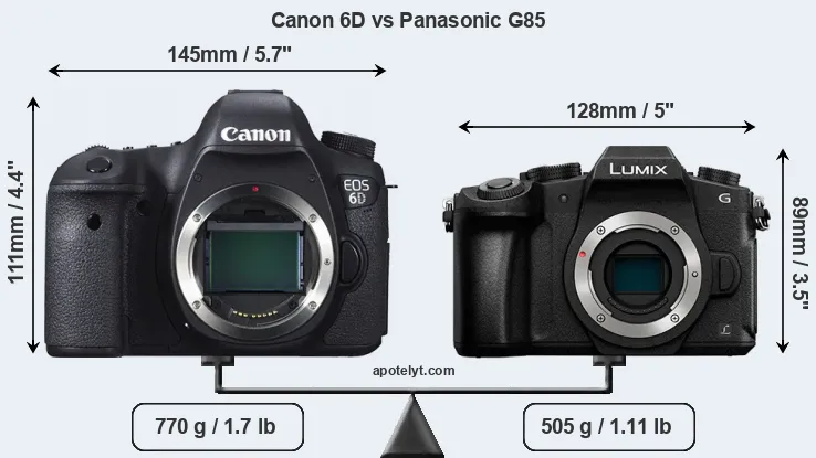 The physical size and weight of the Canon 6D and the Panasonic G85 are illustrated in the side-by-side display below. The two cameras are presented according to their relative size. Three consecutive perspectives from the front, the top, and the back are available. All width, height and depth dimensions are rounded to the nearest millimeter.