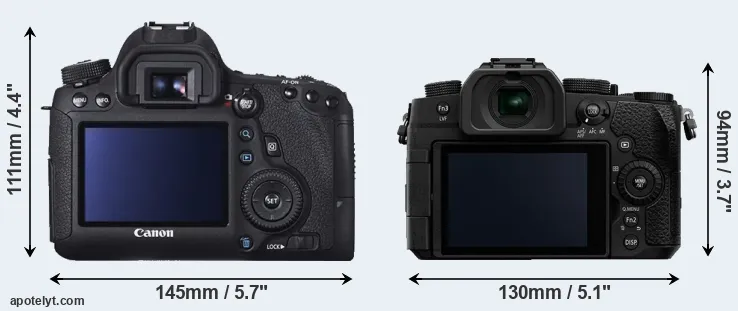 The physical size and weight of the Canon 6D and the Panasonic G95 are illustrated in the side-by-side display below. The two cameras are presented according to their relative size. Three consecutive views from the front, the top, and the rear side are shown. All size dimensions are rounded to the nearest millimeter.