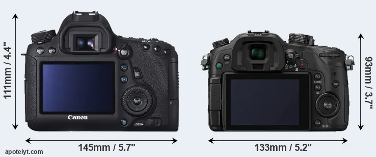 An illustration of the physical size and weight of the Canon 6D and the Panasonic GH4 is provided in the side-by-side display below. The two cameras are presented according to their relative size. Three consecutive perspectives from the front, the top, and the back are available. All width, height and depth dimensions are rounded to the nearest millimeter.