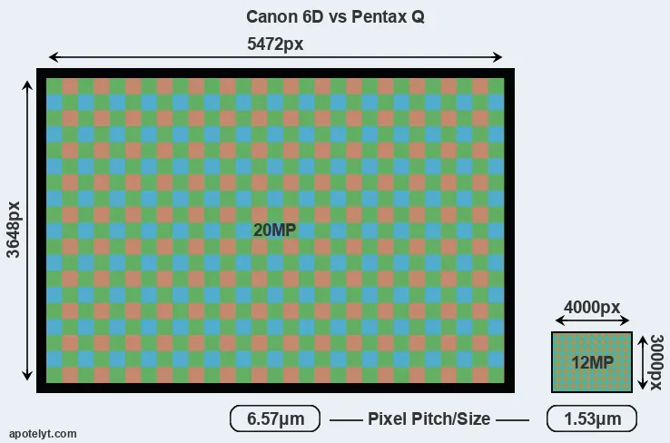 With 20MP, the 6D offers a higher resolution than the Pentax Q (12MP), but the 6D nevertheless has larger individual pixels (pixel pitch of 6.57μm versus 1.53μm for the Pentax Q) due to its larger sensor. Moreover, the 6D is a somewhat more recent model (by 1 year and 2 months) than the Pentax Q, and its sensor might have benefitted from technological advances during this time that further enhance the light gathering capacity of its pixels.