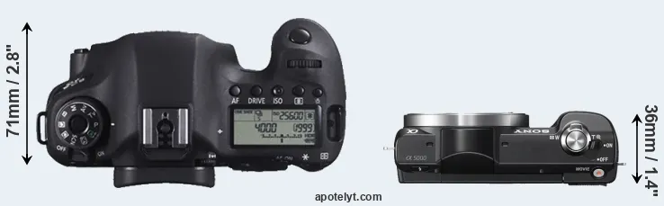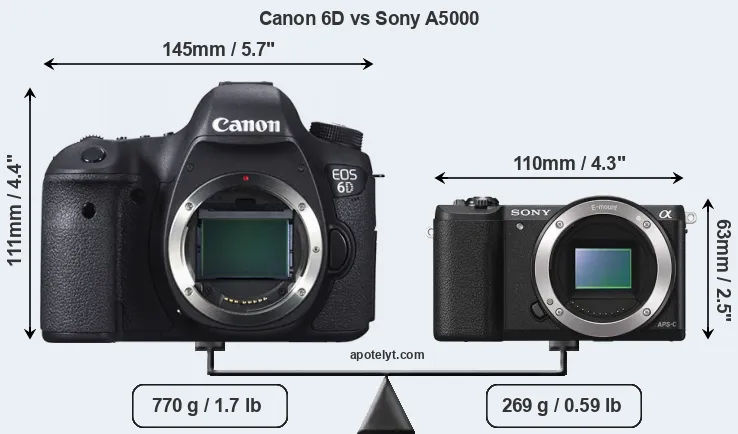An illustration of the physical size and weight of the Canon 6D and the Sony A5000 is provided in the side-by-side display below. The two cameras are presented according to their relative size. Three consecutive views from the front, the top, and the rear side are shown. All width, height and depth dimensions are rounded to the nearest millimeter.