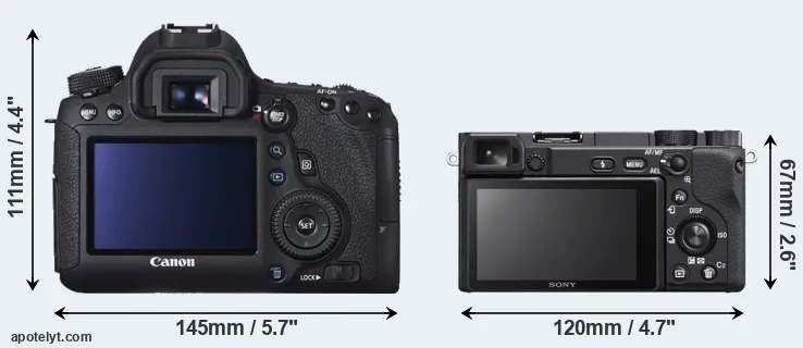 The side-by-side display below illustrates the physical size and weight of the Canon 6D and the Sony A6400. The two cameras are presented according to their relative size. Three successive views from the front, the top, and the rear are shown. All width, height and depth dimensions are rounded to the nearest millimeter.