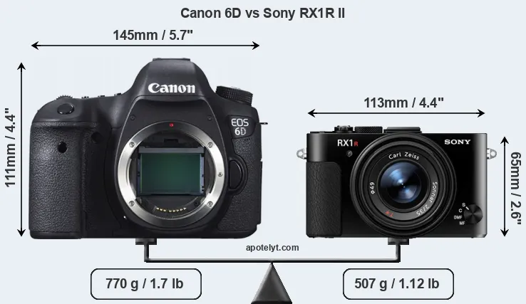 An illustration of the physical size and weight of the Canon 6D and the Sony RX1R II is provided in the side-by-side display below. The two cameras are presented according to their relative size. Three consecutive perspectives from the front, the top, and the back are available. All width, height and depth measures are rounded to the nearest millimeter.
