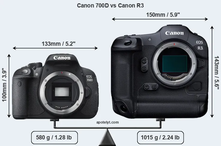 If the front view area (width x height) of the cameras is taken as an aggregate measure of their size, the Canon R3 is considerably larger (61 percent) than the Canon 700D. Moreover, the R3 is substantially heavier (75 percent) than the 700D. It is noteworthy in this context that the R3 is splash and dust-proof, while the 700D does not feature any corresponding weather-sealing.