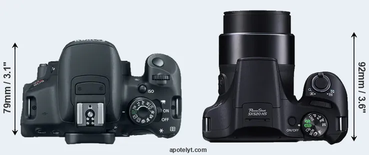 The physical size and weight of the Canon 700D and the Canon SX520 are illustrated in the side-by-side display below. The two cameras are presented according to their relative size. Three consecutive perspectives from the front, the top, and the back are available. All width, height and depth dimensions are rounded to the nearest millimeter.