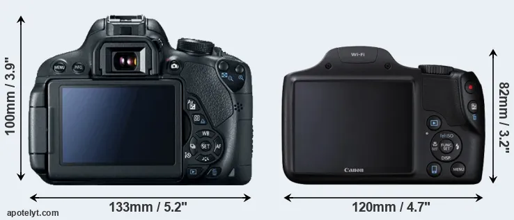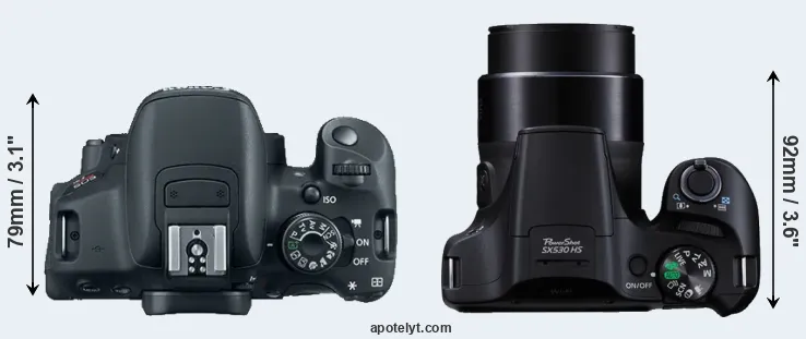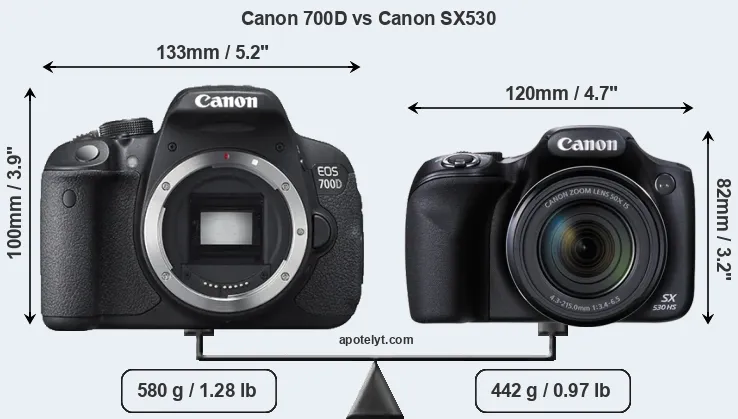 The physical size and weight of the Canon 700D and the Canon SX530 are illustrated in the side-by-side display below. The two cameras are presented according to their relative size. Three consecutive perspectives from the front, the top, and the back are available. All width, height and depth dimensions are rounded to the nearest millimeter.