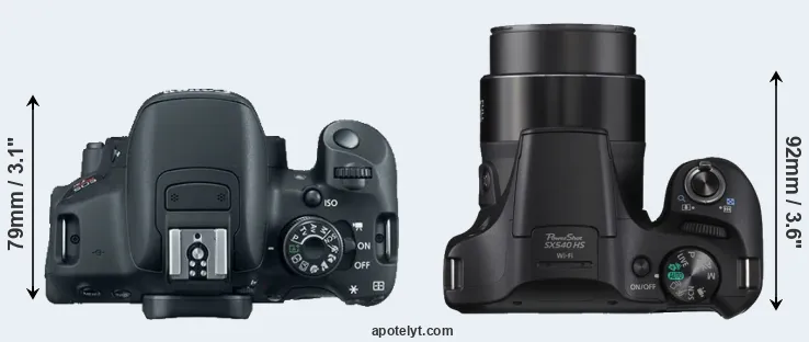 The side-by-side display below illustrates the physical size and weight of the Canon 700D and the Canon SX540. The two cameras are presented according to their relative size. Three consecutive views from the front, the top, and the rear side are shown. All width, height and depth dimensions are rounded to the nearest millimeter.