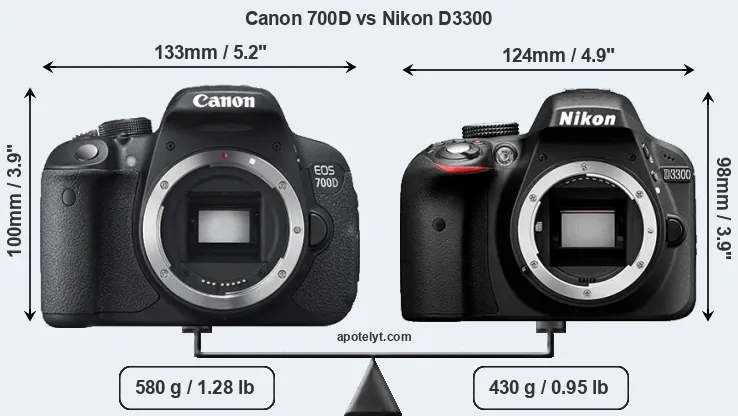 If the front view area (width x height) of the cameras is taken as an aggregate measure of their size, the Nikon D3300 is notably smaller (9 percent) than the Canon 700D. Moreover, the D3300 is markedly lighter (26 percent) than the 700D. In this context, it is worth noting that neither the 700D nor the D3300 are weather-sealed.