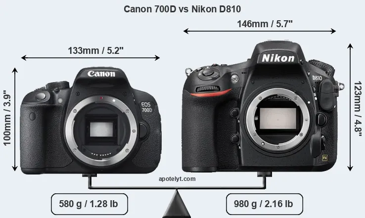 If the front view area (width x height) of the cameras is taken as an aggregate measure of their size, the Nikon D810 is notably larger (35 percent) than the Canon 700D. Moreover, the D810 is substantially heavier (69 percent) than the 700D. It is noteworthy in this context that the D810 is splash and dust-proof, while the 700D does not feature any corresponding weather-sealing.