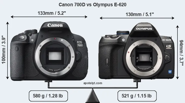 The side-by-side display below illustrates the physical size and weight of the Canon 700D and the Olympus E-620. The two cameras are presented according to their relative size. Three successive views from the front, the top, and the rear are shown. All width, height and depth measures are rounded to the nearest millimeter.