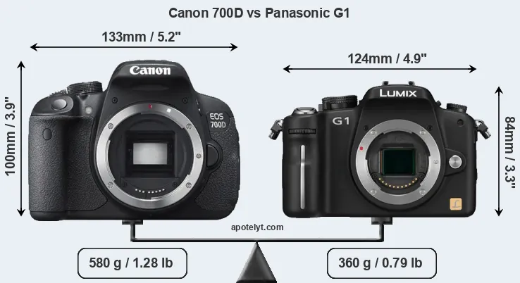 An illustration of the physical size and weight of the Canon 700D and the Panasonic G1 is provided in the side-by-side display below. The two cameras are presented according to their relative size. Three consecutive perspectives from the front, the top, and the back are available. All width, height and depth measures are rounded to the nearest millimeter.