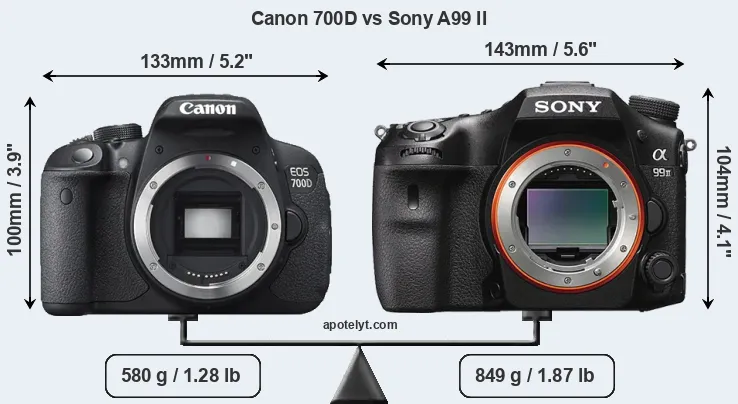 If the front view area (width x height) of the cameras is taken as an aggregate measure of their size, the Sony A99 II is notably larger (12 percent) than the Canon 700D. Moreover, the A99 II is substantially heavier (46 percent) than the 700D. It is noteworthy in this context that the A99 II is splash and dust-proof, while the 700D does not feature any corresponding weather-sealing.
