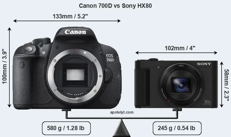 The physical size and weight of the Canon 700D and the Sony HX80 are illustrated in the side-by-side display below. The two cameras are presented according to their relative size. Three successive views from the front, the top, and the rear are shown. All width, height and depth measures are rounded to the nearest millimeter.