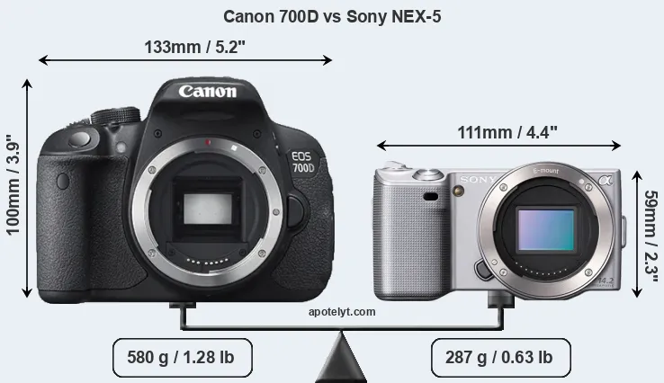 The physical size and weight of the Canon 700D and the Sony NEX-5 are illustrated in the side-by-side display below. The two cameras are presented according to their relative size. Three consecutive perspectives from the front, the top, and the back are available. All width, height and depth dimensions are rounded to the nearest millimeter.