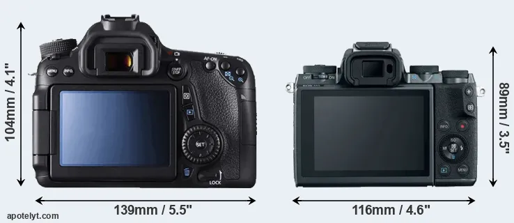 The physical size and weight of the Canon 70D and the Canon M5 are illustrated in the side-by-side display below. The two cameras are presented according to their relative size. Three consecutive views from the front, the top, and the rear side are shown. All width, height and depth dimensions are rounded to the nearest millimeter.