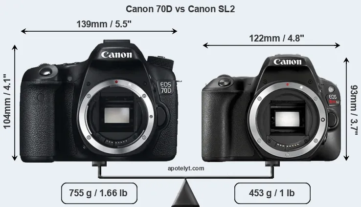 If the front view area (width x height) of the cameras is taken as an aggregate measure of their size, the Canon SL2 is notably smaller (22 percent) than the Canon 70D. Moreover, the SL2 is substantially lighter (40 percent) than the 70D. It is worth mentioning in this context that the 70D is splash and dust resistant, while the SL2 does not feature any corresponding weather-sealing.