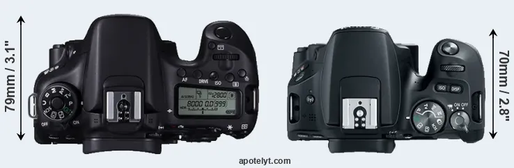 The physical size and weight of the Canon 70D and the Canon SL2 are illustrated in the side-by-side display below. The two cameras are presented according to their relative size. Three consecutive views from the front, the top, and the rear side are shown. All width, height and depth measures are rounded to the nearest millimeter.