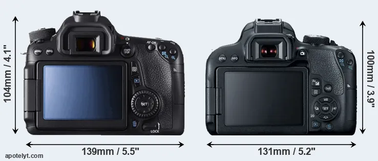 If the front view area (width x height) of the cameras is taken as an aggregate measure of their size, the Canon T7i is notably smaller (9 percent) than the Canon 70D. Moreover, the T7i is markedly lighter (30 percent) than the 70D. It is worth mentioning in this context that the 70D is splash and dust resistant, while the T7i does not feature any corresponding weather-sealing.