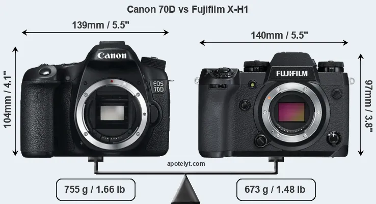 An illustration of the physical size and weight of the Canon 70D and the Fujifilm X-H1 is provided in the side-by-side display below. The two cameras are presented according to their relative size. Three consecutive perspectives from the front, the top, and the back are available. All width, height and depth measures are rounded to the nearest millimeter.