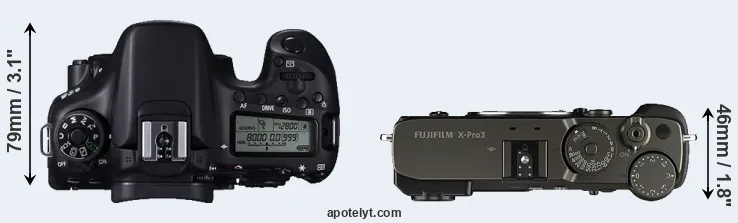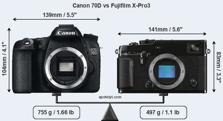 The physical size and weight of the Canon 70D and the Fujifilm X-Pro3 are illustrated in the side-by-side display below. The two cameras are presented according to their relative size. Three consecutive perspectives from the front, the top, and the back are available. All width, height and depth dimensions are rounded to the nearest millimeter.