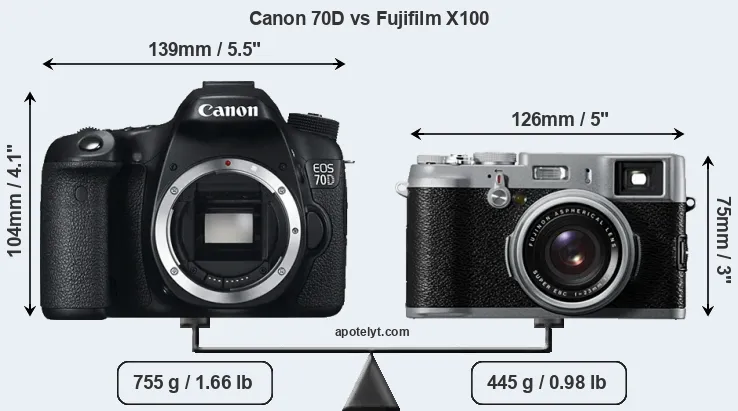 An illustration of the physical size and weight of the Canon 70D and the Fujifilm X100 is provided in the side-by-side display below. The two cameras are presented according to their relative size. Three successive views from the front, the top, and the rear are shown. All width, height and depth dimensions are rounded to the nearest millimeter.