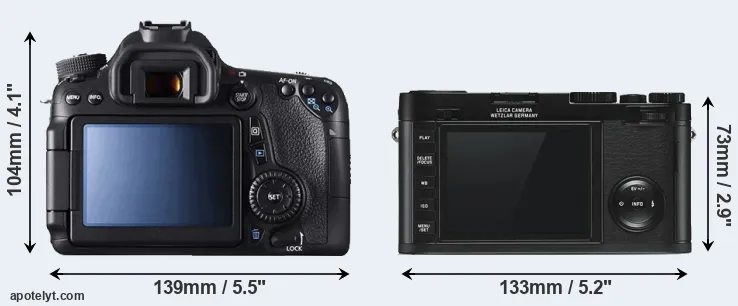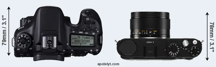 The side-by-side display below illustrates the physical size and weight of the Canon 70D and the Leica X Typ 113. The two cameras are presented according to their relative size. Three consecutive perspectives from the front, the top, and the back are available. All size dimensions are rounded to the nearest millimeter.