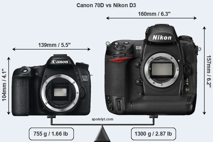 The side-by-side display below illustrates the physical size and weight of the Canon 70D and the Nikon D3. The two cameras are presented according to their relative size. Three consecutive views from the front, the top, and the rear side are shown. All width, height and depth dimensions are rounded to the nearest millimeter.