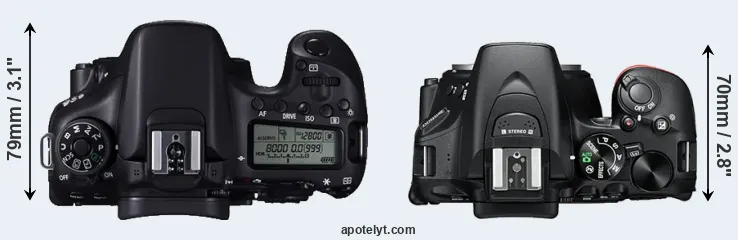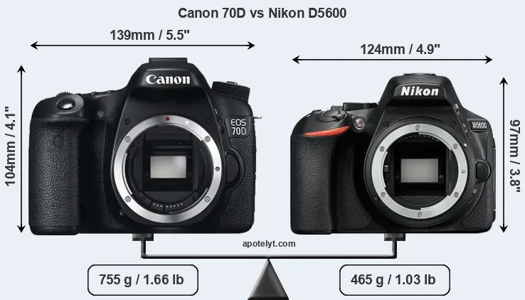 An illustration of the physical size and weight of the Canon 70D and the Nikon D5600 is provided in the side-by-side display below. The two cameras are presented according to their relative size. Three consecutive perspectives from the front, the top, and the back are available. All width, height and depth measures are rounded to the nearest millimeter.