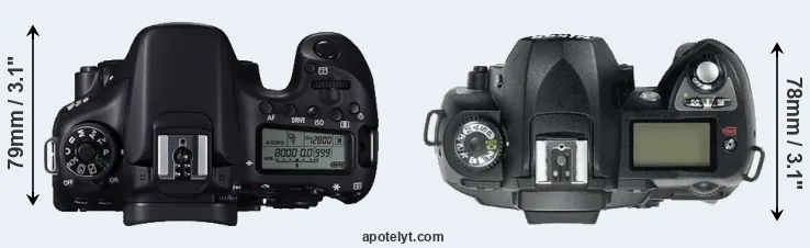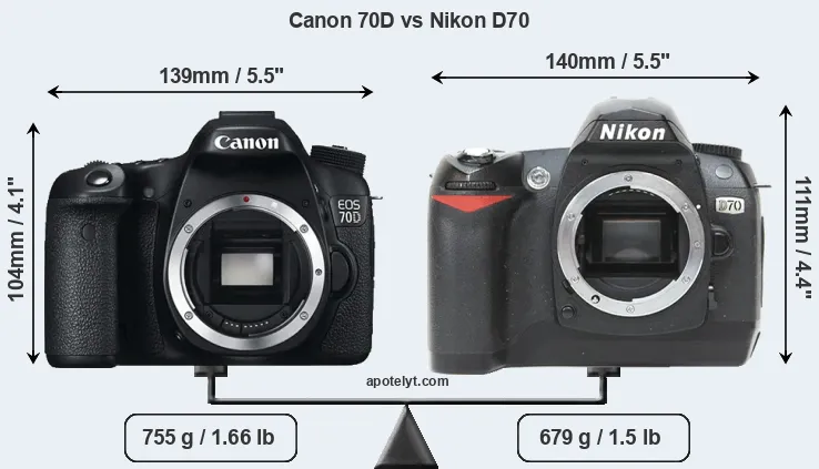 The physical size and weight of the Canon 70D and the Nikon D70 are illustrated in the side-by-side display below. The two cameras are presented according to their relative size. Three consecutive perspectives from the front, the top, and the back are available. All size dimensions are rounded to the nearest millimeter.