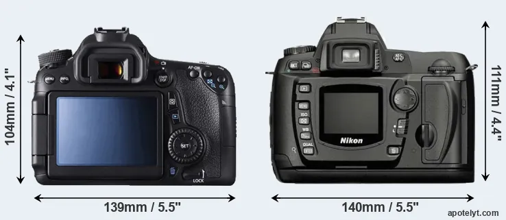 If the front view area (width x height) of the cameras is taken as an aggregate measure of their size, the Nikon D70 is notably larger (7 percent) than the Canon 70D. However, the D70 is markedly lighter (10 percent) than the 70D. It is worth mentioning in this context that the 70D is splash and dust resistant, while the D70 does not feature any corresponding weather-sealing.
