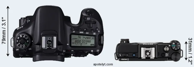 An illustration of the physical size and weight of the Canon 70D and the Pentax Q is provided in the side-by-side display below. The two cameras are presented according to their relative size. Three consecutive perspectives from the front, the top, and the back are available. All size dimensions are rounded to the nearest millimeter.