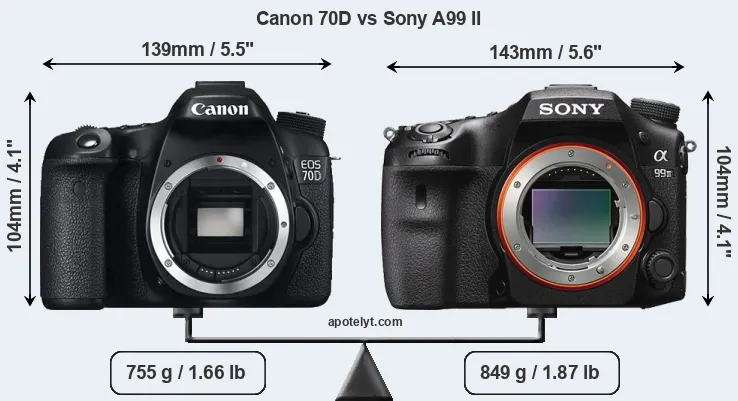An illustration of the physical size and weight of the Canon 70D and the Sony A99 II is provided in the side-by-side display below. The two cameras are presented according to their relative size. Three consecutive perspectives from the front, the top, and the back are available. All size dimensions are rounded to the nearest millimeter.