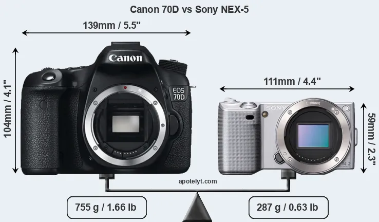 The above size and weight comparisons are to some extent incomplete since they do not consider the interchangeable lenses that both of these cameras require. Both cameras have similarly sized sensors, but DSLRs have a larger flange-to-focal plane distance than mirrorless cameras, which imposes contraints on the optical engineering process and generally leads to bigger and heavier lenses. You can compare the optics available for the two cameras in the Canon EF Lens Catalog (70D) and the Sony E-Mount Lens Catalog (NEX-5). Mirrorless cameras, such as the NEX-5, have moreover the advantage that they can use many lenses from other systems via adapters, as they have a relatively short flange to focal plane distance.