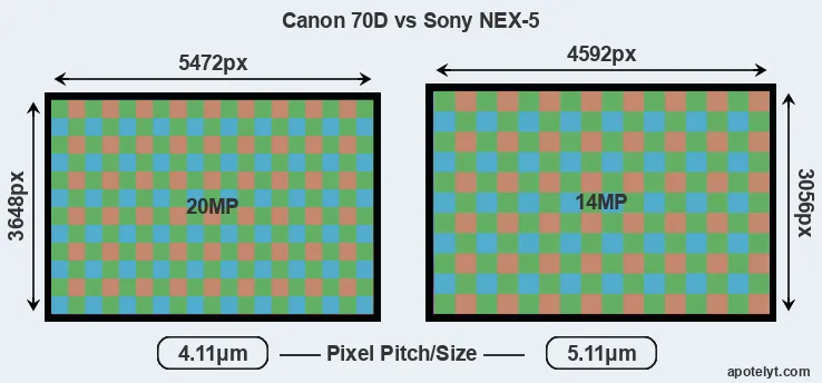 Despite having a smaller sensor, the Canon 70D offers a higher resolution of 20 megapixels, compared with 14 MP of the Sony NEX-5. This megapixels advantage comes at the cost of a higher pixel density and a smaller size of the individual pixel (with a pixel pitch of 4.11μm versus 5.11μm for the NEX-5). However, it should be noted that the 70D is much more recent (by 3 years and 1 month) than the NEX-5, and its sensor will have benefitted from technological advances during this time that make it possible to gather light more efficiently.