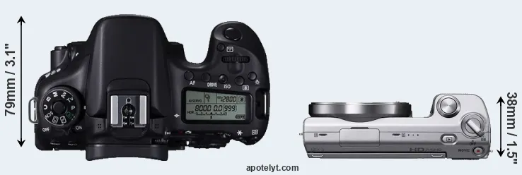 An illustration of the physical size and weight of the Canon 70D and the Sony NEX-5 is provided in the side-by-side display below. The two cameras are presented according to their relative size. Three consecutive perspectives from the front, the top, and the back are available. All size dimensions are rounded to the nearest millimeter.