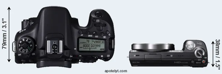 The side-by-side display below illustrates the physical size and weight of the Canon 70D and the Sony NEX-5N. The two cameras are presented according to their relative size. Three successive views from the front, the top, and the rear are shown. All width, height and depth measures are rounded to the nearest millimeter.