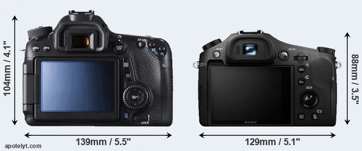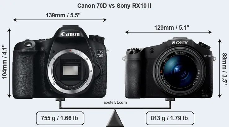 The side-by-side display below illustrates the physical size and weight of the Canon 70D and the Sony RX10 II. The two cameras are presented according to their relative size. Three successive views from the front, the top, and the rear are shown. All width, height and depth dimensions are rounded to the nearest millimeter.