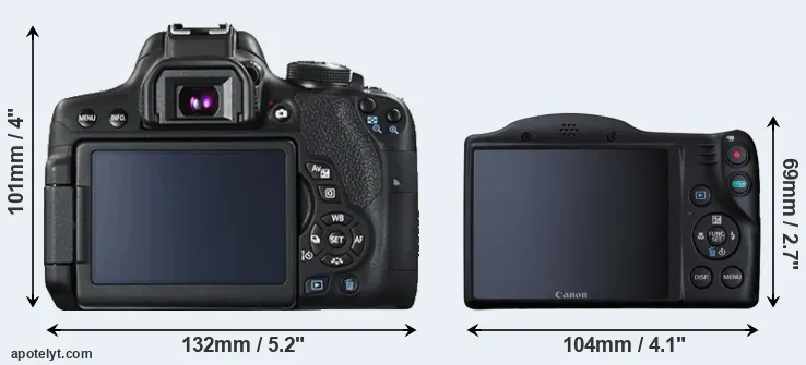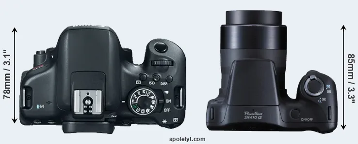 The side-by-side display below illustrates the physical size and weight of the Canon 750D and the Canon SX410. The two cameras are presented according to their relative size. Three consecutive views from the front, the top, and the rear side are shown. All size dimensions are rounded to the nearest millimeter.