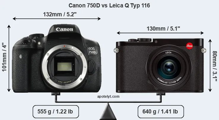 An illustration of the physical size and weight of the Canon 750D and the Leica Q Typ 116 is provided in the side-by-side display below. The two cameras are presented according to their relative size. Three consecutive views from the front, the top, and the rear side are shown. All width, height and depth measures are rounded to the nearest millimeter.