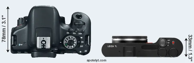 The side-by-side display below illustrates the physical size and weight of the Canon 750D and the Leica TL. The two cameras are presented according to their relative size. Three successive views from the front, the top, and the rear are shown. All width, height and depth measures are rounded to the nearest millimeter.