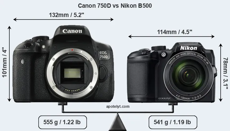 An illustration of the physical size and weight of the Canon 750D and the Nikon B500 is provided in the side-by-side display below. The two cameras are presented according to their relative size. Three consecutive views from the front, the top, and the rear side are shown. All size dimensions are rounded to the nearest millimeter.