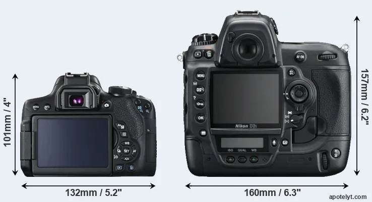 The side-by-side display below illustrates the physical size and weight of the Canon 750D and the Nikon D3S. The two cameras are presented according to their relative size. Three successive views from the front, the top, and the rear are shown. All width, height and depth dimensions are rounded to the nearest millimeter.