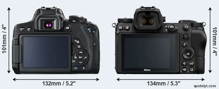 The physical size and weight of the Canon 750D and the Nikon Z6 are illustrated in the side-by-side display below. The two cameras are presented according to their relative size. Three consecutive views from the front, the top, and the rear side are shown. All width, height and depth dimensions are rounded to the nearest millimeter.