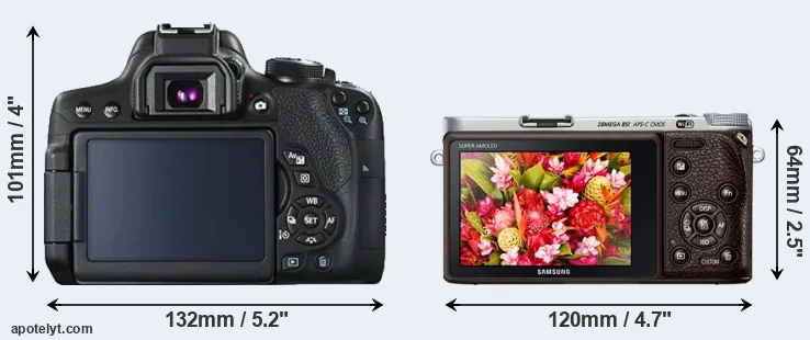 Going beyond this snapshot of core features and characteristics, what are the differences between the Canon EOS 750D and the Samsung NX500? Which one should you buy? Read on to find out how these two cameras compare with respect to their body size, their imaging sensors, their shooting features, their input-output connections, and their reception by expert reviewers.